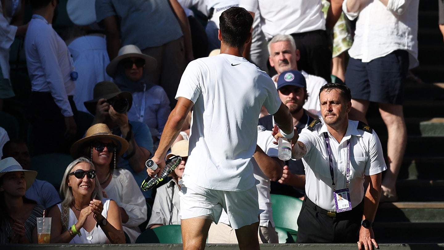 Alcaraz was quick to help the cause and grabbed a water bottle near his bench and drove it over to that spectator. A member of Wimbledon Security also brought an umbrella over to help shade the person.