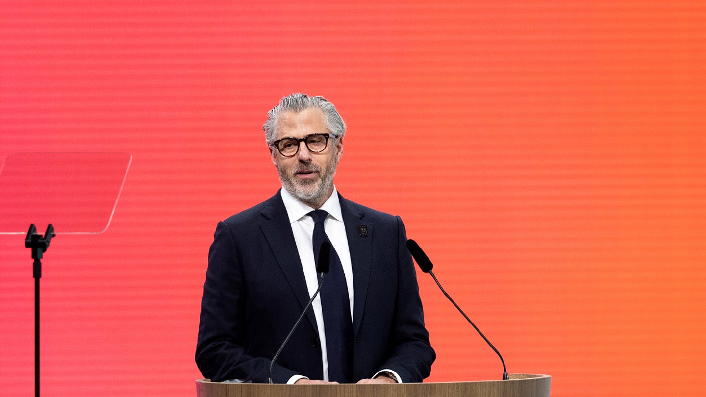 Casey Wasserman, chairman of the LA2028 Olympics Organizing Committee, speaks during a ceremonial lighting of the LA28 Olympic Cauldron at the Memorial Coliseum in Los Angeles January 13, 2026, ahead of the launch of ticket registration for the 2028 Summer Olympics. (Frederic J. Brown/AFP via Getty Images)
