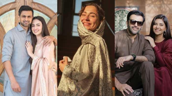 Former Pakistan -Captain Shoaib Malik (left) with actress wife Sana Javed; Actor Haniya Aamir; And TV actors Hassan Ahmed with wife Sunita Marshall. – Instagram/@sanajaved.official/@haniaheheofficial/@Sunitamarshallofficial