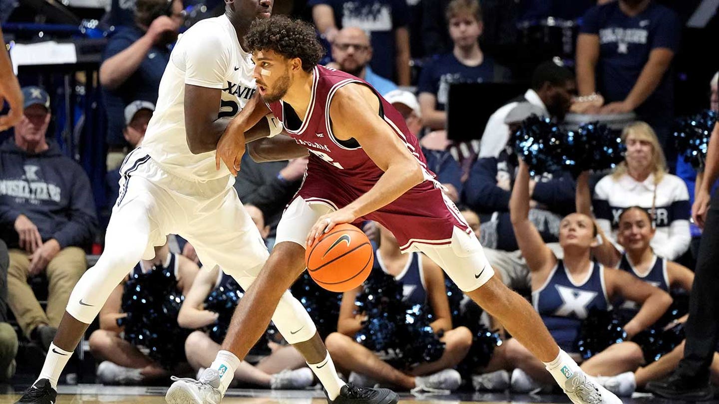 Allen Graves (22) of the Santa Clara Broncos dribbles the ball during a college basketball game against the Xavier Musketeers at the Cintas Center in Cincinnati, Ohio on Nov. 10, 2025. (Mitchell Layton/Getty Images)
