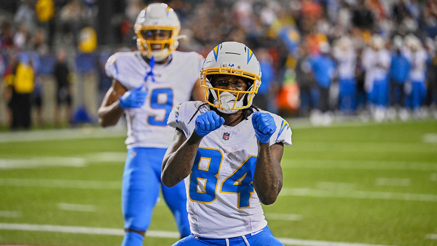 Los Angeles Chargers Wide Receiver Keandre Lambert-Smith (84) celebrates his touchdown in the first half of the Pro Football Hall of Fame NFL Preseason Game against Detroit Lions, Thursday 31 July 2025, in Canton, Ohio. (AP Photo/David Richard)