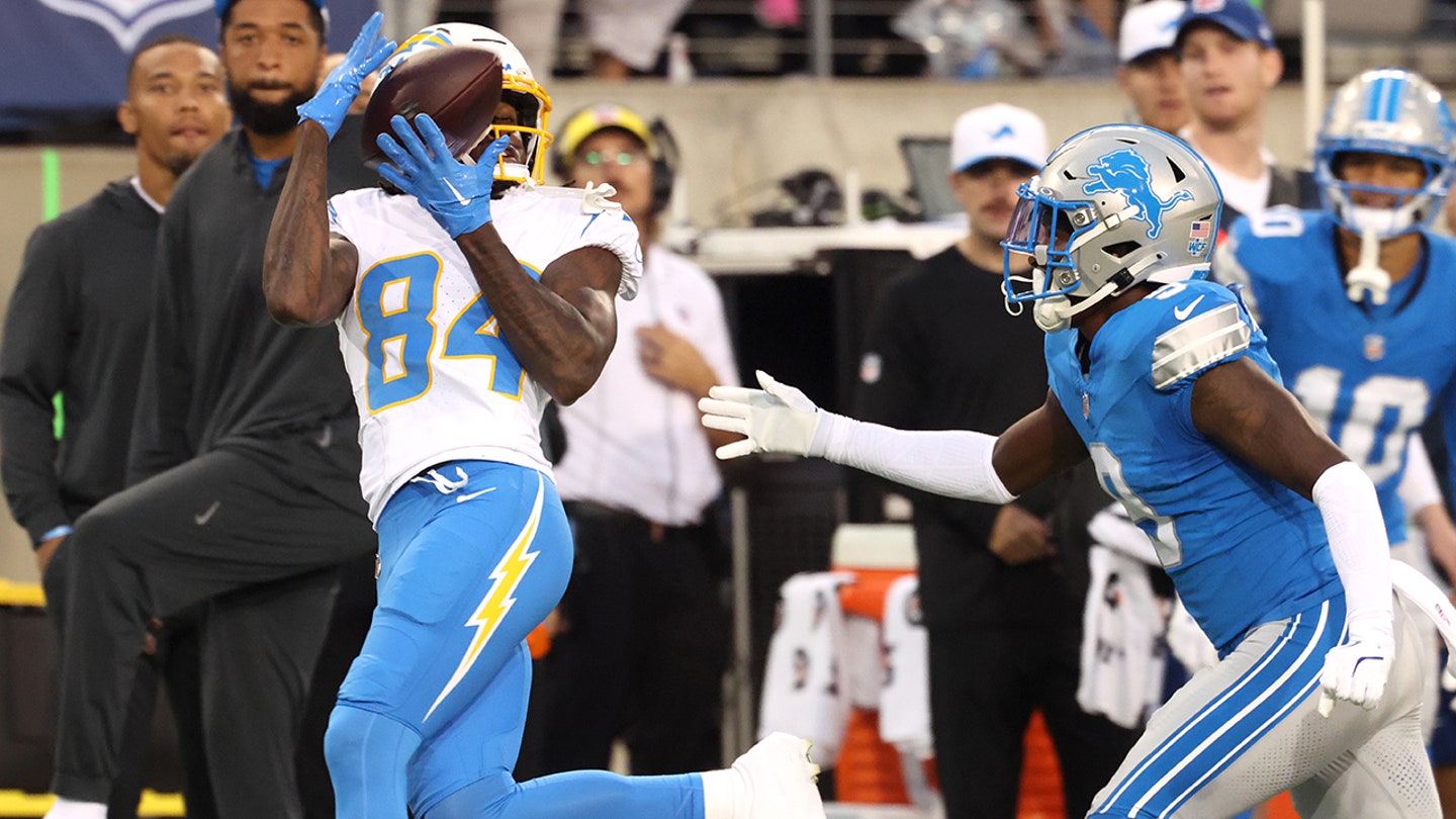 Los Angeles Chargers Broad receives Kandre Lambert-Smith (84) catches a catch against Detroit Lions Cornerback Ennis Rakestraw Jr. (9) In the first quarter of Tom Benson Hall of Fame Stadium. (Charles Leclaire/Imag images)