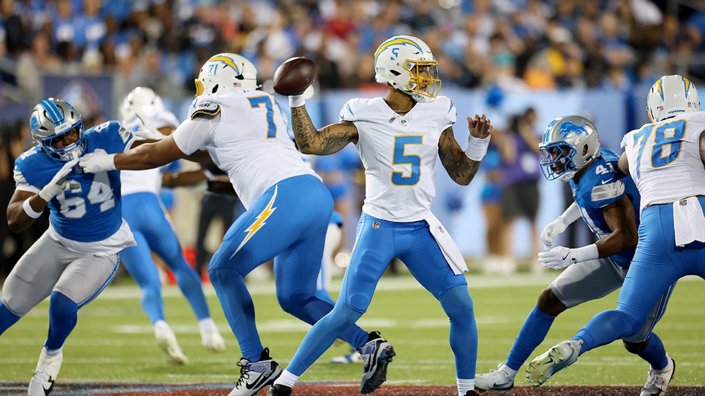 Los Angeles Chargers Quarterback Trey Lance (5) throws in the second quarter against the Detroit Lions at Tom Benson Hall of Fame Stadium. (Scott Galvin/Imag images)