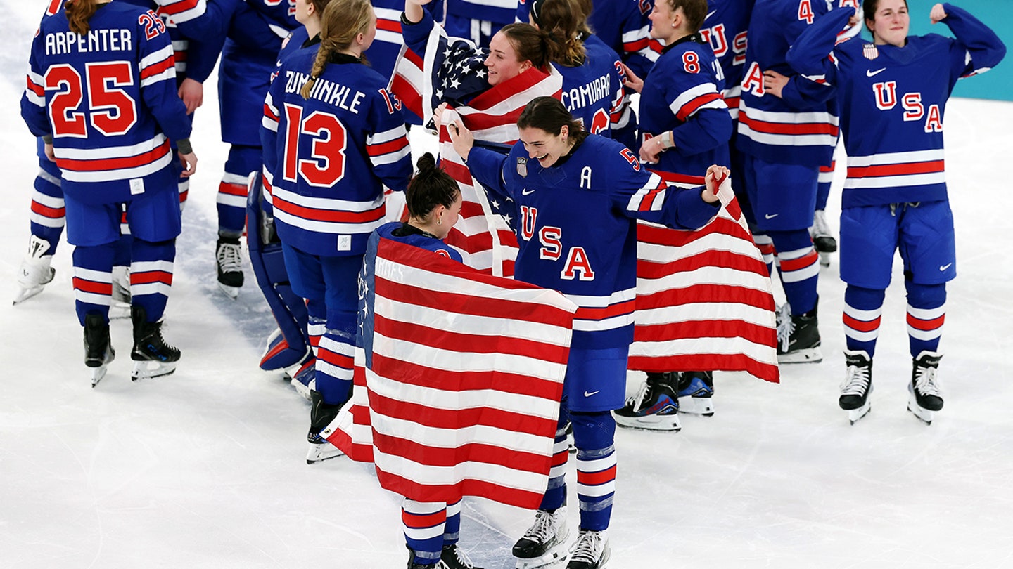 Megan Keller (5) celebrates with a flag with Cayla Barnes (3) of Team United States after scoring the game-winning goal in overtime during the women’s gold medal game against Canada on Day 13 of the Milan Cortina 2026 Winter Olympics at the Milan Santagiulia Ice Hockey Arena in Milan, Italy, on February 2026. (Sarah Stier/Getty Images)