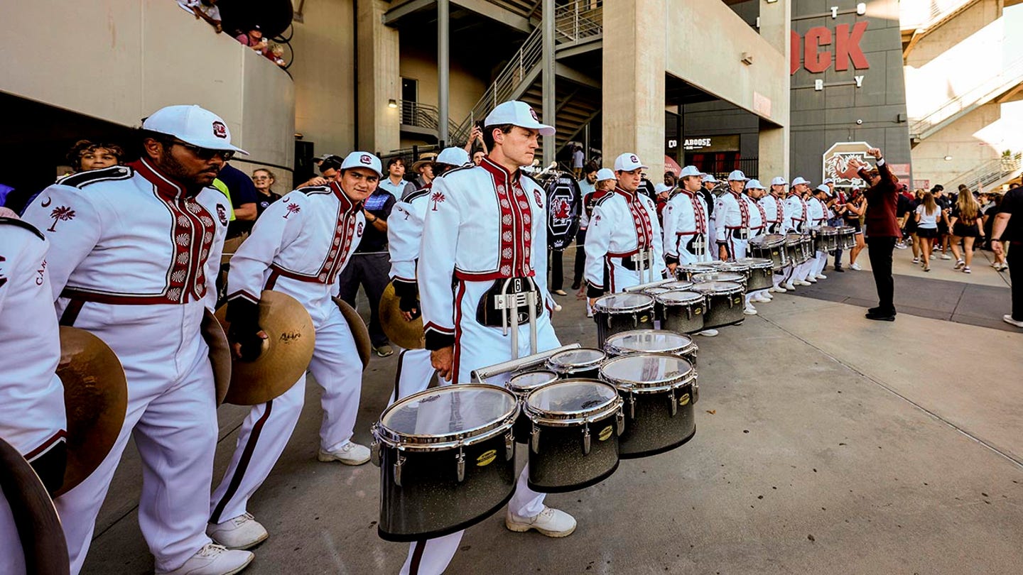 South Carolina’s Drum Line greets players under “Gamecock Walk” before a NCAA College -Football match against Vanderbilt, Saturday, September 13, 2025, in Columbia, South Carolina. (AP Photo/David Yeazell)