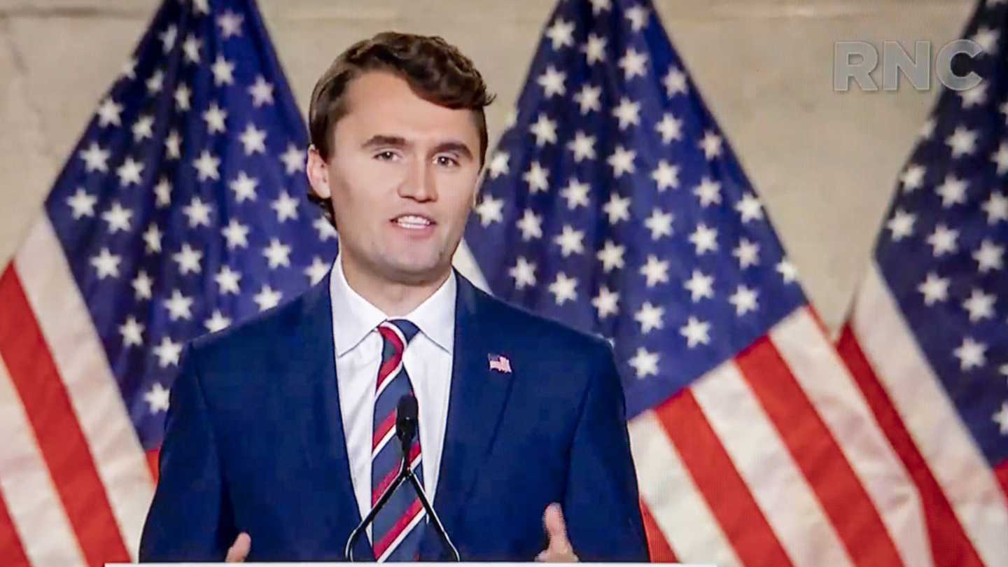 Charlie Kirk, founder and president of Turning Point USA, speaks under the Republican national convention seen on a laptop in Tiskilwa, Illinois, USA, Monday, August 24, 2020. (Daniel Acker/Bloomberg/Getty Images)