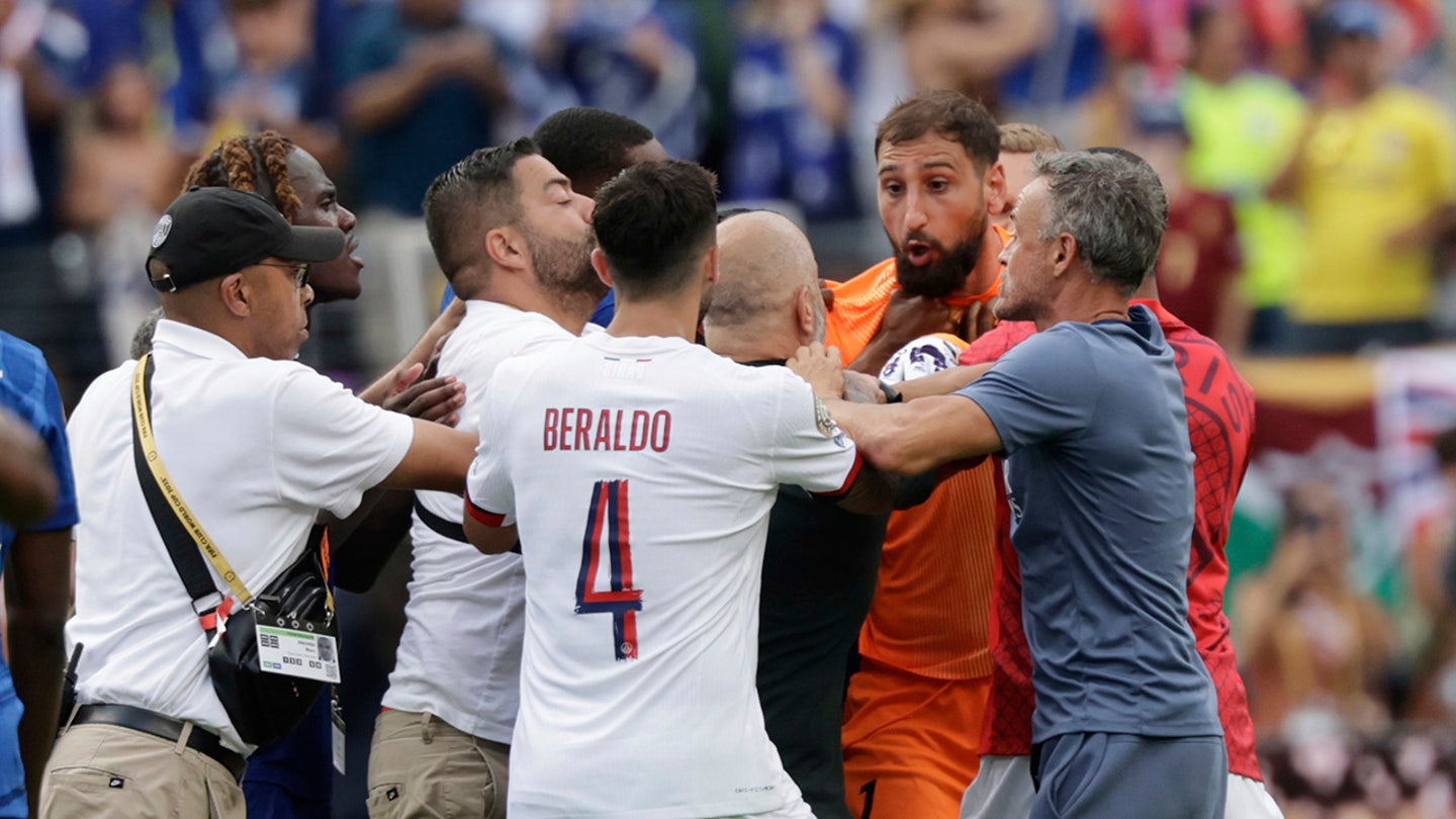 Enrique was near the midfield and seemed to push Pedro in the throat. Donnarumma then came over and pushed Pedro. It is unclear what started the incident.