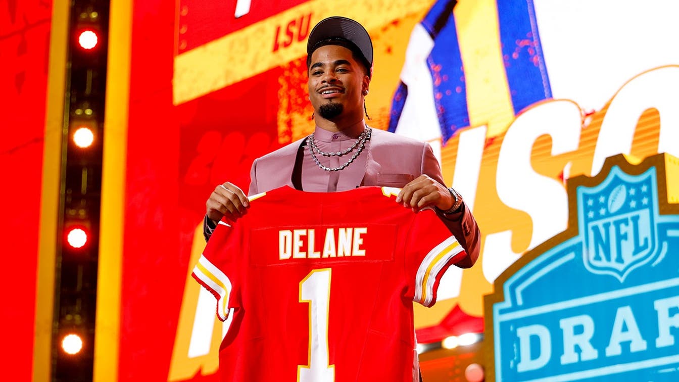 Mansoor Delane of LSU poses for a photo after being selected sixth overall by the Kansas City Chiefs during the first round of the 2026 NFL draft at Acrisure Stadium in Pittsburgh, Pennsylvania on April 23, 2026. (Lauren Leigh Bacho/Getty Images)