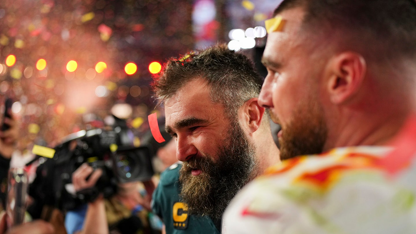 Jason Kelce, #62 by Philadelphia Eagles, talks to Travis Kelce, #87 by Kansas City Chiefs, after the Super Bowl LVII at State Farm Stadium on February 12, 2023, in Glendale, Arizona. (Cooper Neill/Getty Images)
