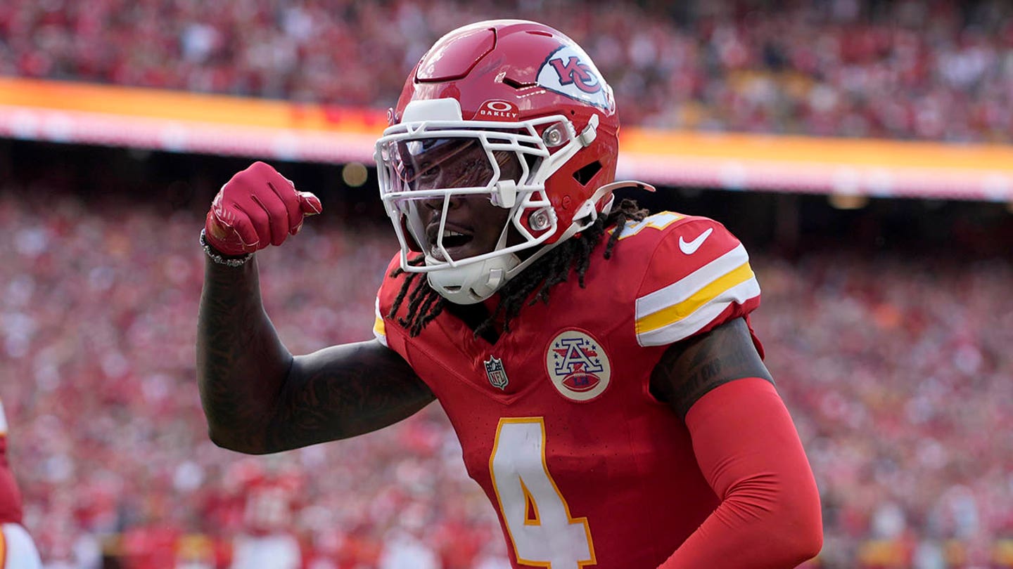 Kansas City Chiefs wide receiver Rashee Rice celebrates after scoring during the first half of a NFL football match against Cincinnati Bengals Sunday 15 September 2024 in Kansas City, Mo. (AP Photo/Charlie Riedel)