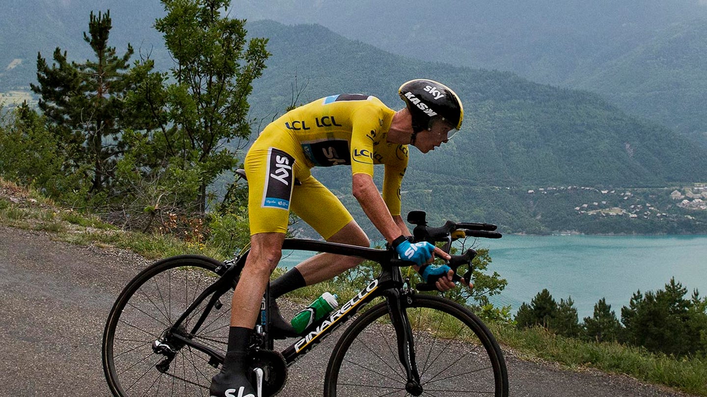 Overall leader’s yellow jersey Christopher Froome of Great Britain rides during the 32km individual time trial and seventeenth stage of the 100th edition of the Tour de France cycling race on July 17, 2013 between Embrun and Chorges in southeastern France. (JEFF PACHOUD/AFP via Getty Images)