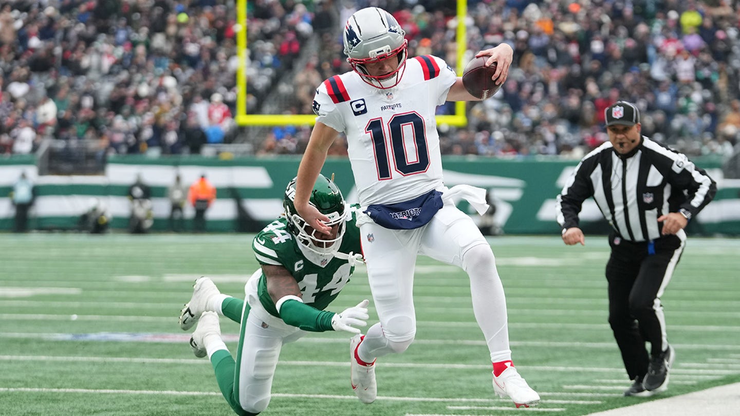 New England Patriots quarterback Drake Maye (10) is run out of bounds by New York Jets linebacker Jamien Sherwood (44) during the first half of an NFL football game, Sunday, Dec. 28, 2025, in East Rutherford, New Jersey. (AP Photo/Frank Franklin)