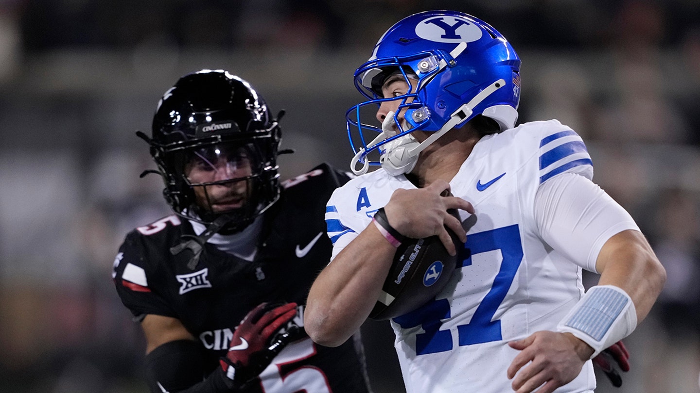BYU quarterback Bear Bachmeier (47) looks at Cincinnati safety Christian Harrison (5) as he runs with the ball during the first half of an NCAA college football game Saturday, Nov. 22, 2025, in Cincinnati (AP Photo/Carolyn Kaster)