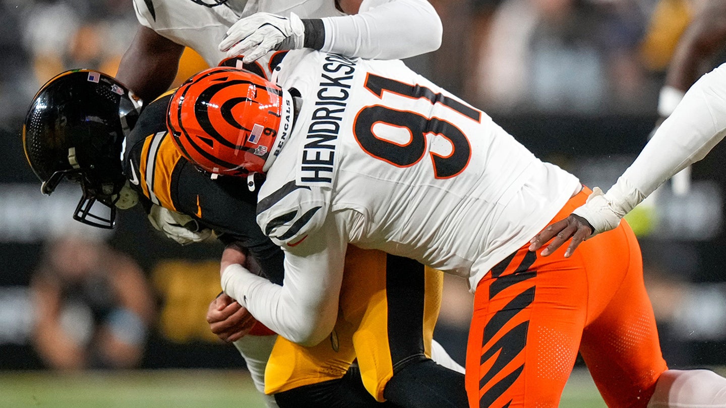 Cincinnati Bengal’s defensive than Trey Hendrickson (91) Sacks Pittsburgh Steelers Quarterback Russell Wilson (3) In the first quarter of the NFL 18 -game between Pittsburgh Steelers and Cincinnati Bengals at Acrisure Stadium in Pittsburg on Saturday, January 4, 2025. (Sam Greene / The Enquirer / USA Today Network via Imag images)