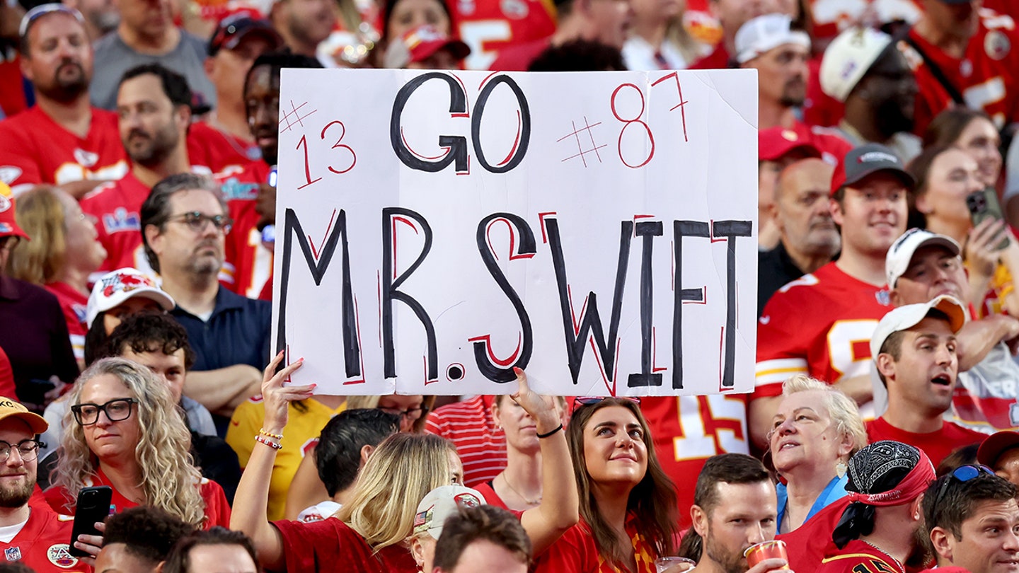 A fan has a sign that says “Go Mr. Swift” with reference to Travis Kelce and Taylor Swift, dating before an NFL game between Baltimore Ravens and Kansas City Chiefs on September 5, 2024, at Geha Field at Arrowhead Stadium in Kansas City, Mo. (Scott Winters/Icon Sportswire via Getty Images)