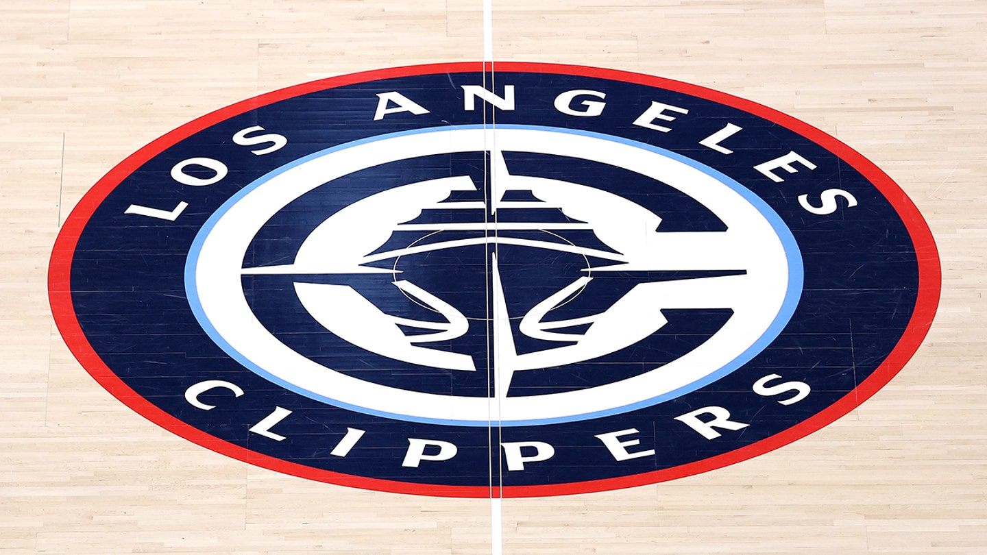 A detailed overview of the Los Angeles Clippers logo at Center Court before the game against Oklahoma City Thunder at the Intuit Dome on March 23, 2025 in Inglewood, California. (Luke Hales/Getty Images)