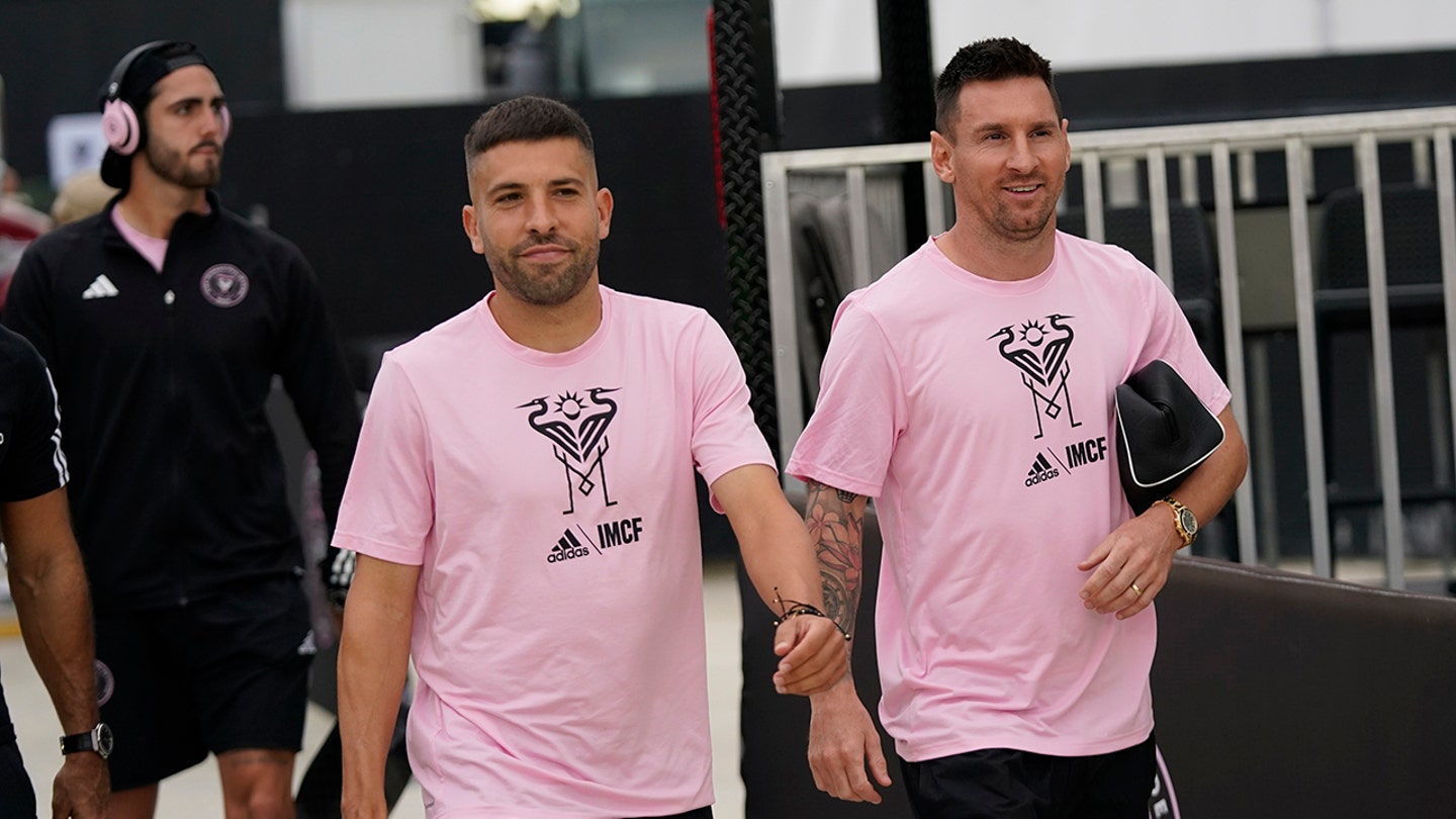 Inter Miami defender Jordi Alba, left and forward Lionel Messi Chat when they arrive before the start of an MLS football match against Toronto FC, Wednesday 20 September 2023, in Fort Lauderdale, Florida. (Wilfredo Lee/AP Photo)