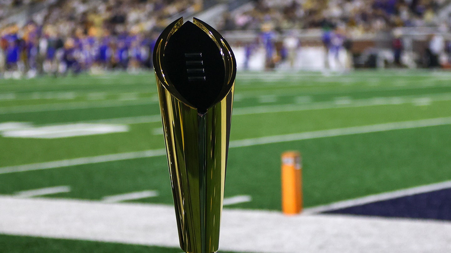 A photo of the college football playoff national championship trophy on the sidelines of a game between the Georgia Tech Yellow Jackets and the Pittsburgh Panthers during the fourth quarter at Bobby Dodd Stadium at Hyundai Field on November 22, 2025 in Atlanta, Georgia. (Brett Davis/Imagn Images)
