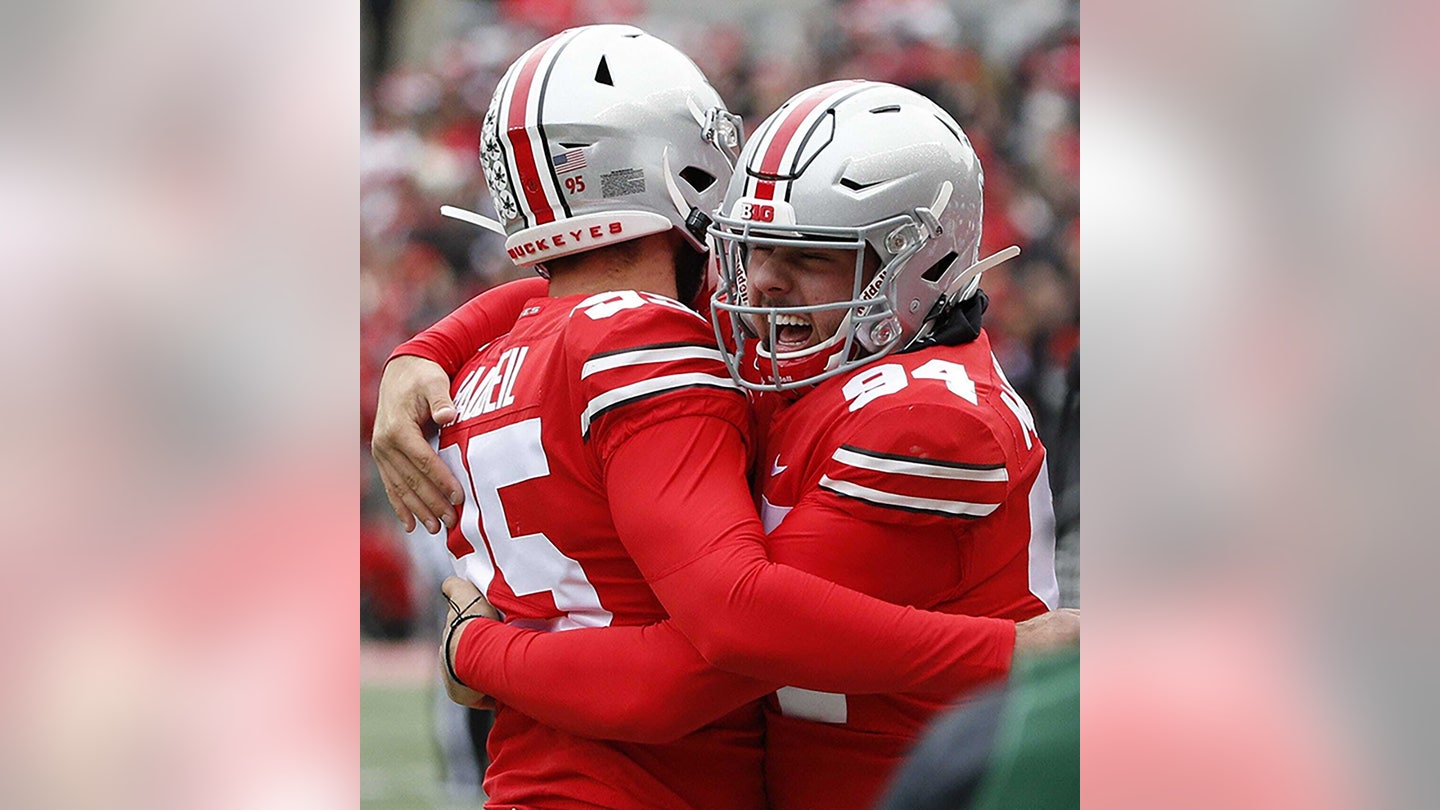 Ohio State Buckeyes Long Snapper Roen McCullough (94) fejrer med Place Kicker Blake Haubeil (95), efter at Haubeil med succes sparkede et onside -spark i løbet af første kvartal af en NCAA Division I College Football Game mellem Buckeyes og Maryland Terrapins lørdag den 9. november 2019, på Ohio Stadium i Columbus, Ohio. (Joshua A. Bickel/Dispatch)