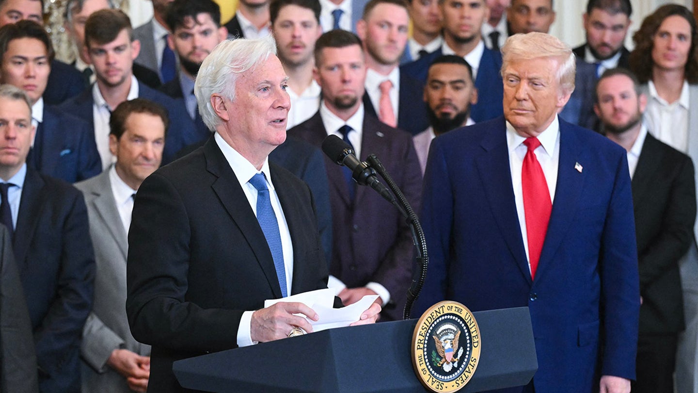 US President Donald Trump is watching as team owner Mark Walter (L) speaks during an event honoring the World Series champion in 2024 Los Angeles Dodgers in the eastern space of the White House of Washington, DC, April 7, 2025. (Saul Loeb/AFP via Getty Images)