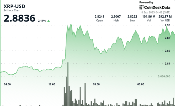 The XRP broke sharply in Monday’s session and climbed from $ 2.83 to $ 2.88 when a breakout-push card tested $ 2.92 on six times average volume. Bulls held over $ 2.86 support but repeated rejection of $ 2.90- $ 2.92 limited momentum. With bold rate cuts near 100% ahead of the meeting on September 17, institutional influxes remain strong – leaving the token consolidating just below critical resistance.