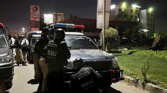 Officers take positions after a police building was attacked by guns in Karachi on February 17, 2023. – Reuters