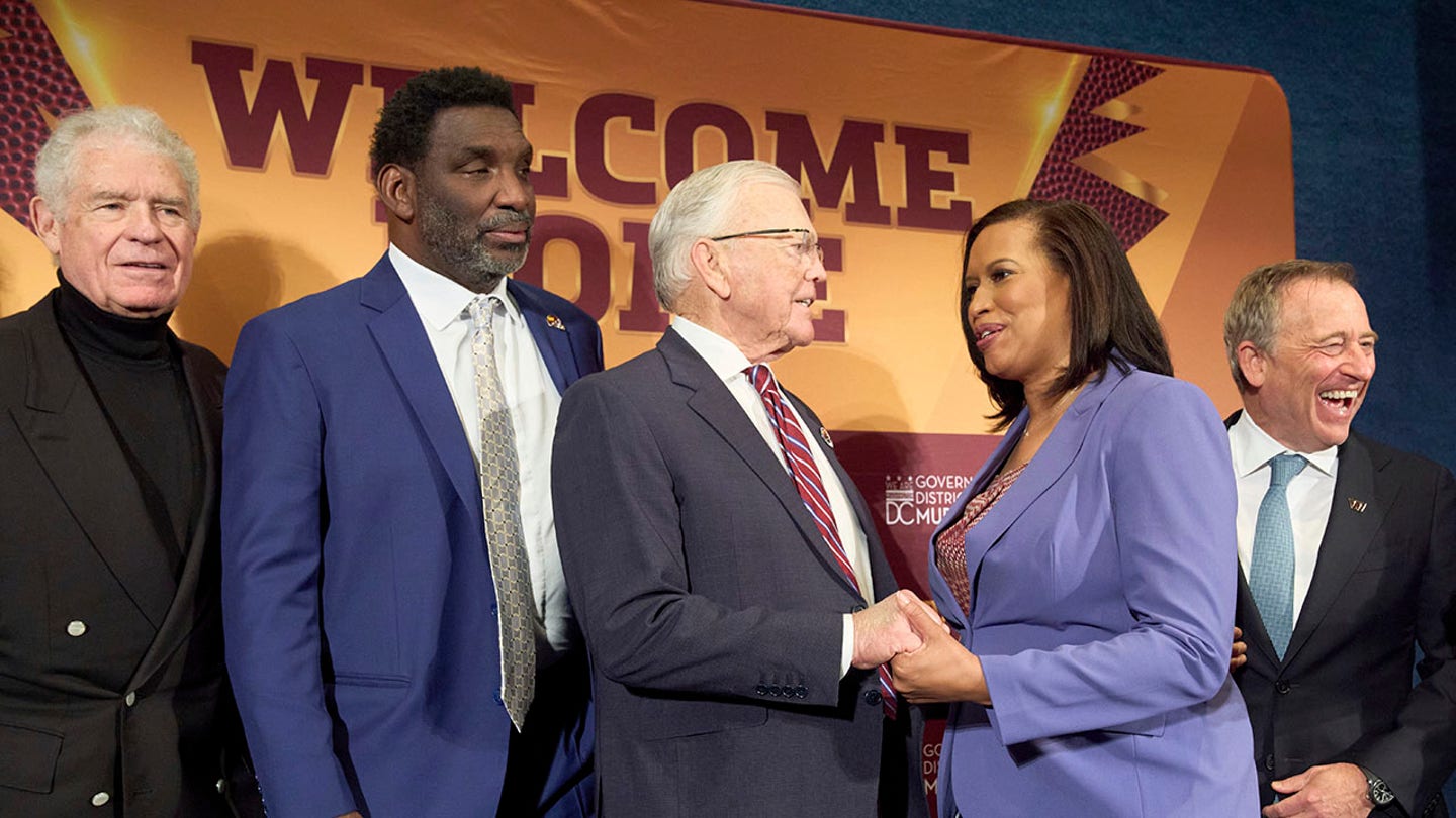 Hall of Fame, who runs back John Riggins, from the left, former Washington commanders Quarterback Doug Williams and former coach Joe Gibbs greet the District of Columbia Mayor Muriel Bowser, next to Washington commanders who control owner Josh Harris, after a announcement that a new home to nfl -football RFK Stadium, Monday 28th, 2025, in the National Press of the Club. (Jacquelyn Martin/AP Photo)