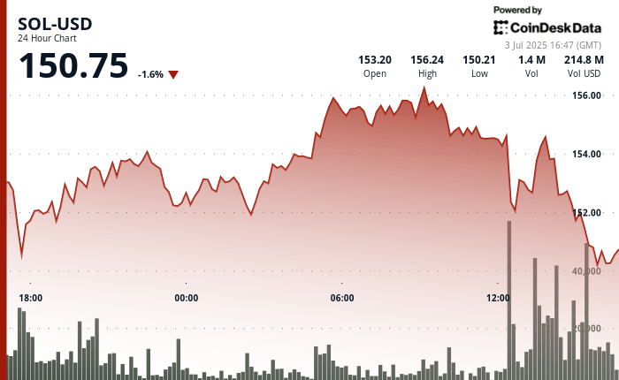 At the time of writing, Sun traded around $ 150.75, dropped 1.6% in the last 24-hour period, according to Coindesk Research’s technical analysis model. Meanwhile the wider crypto market, as the target of the Coindesk 20 index (CD20)has risen 0.13% in the same period.