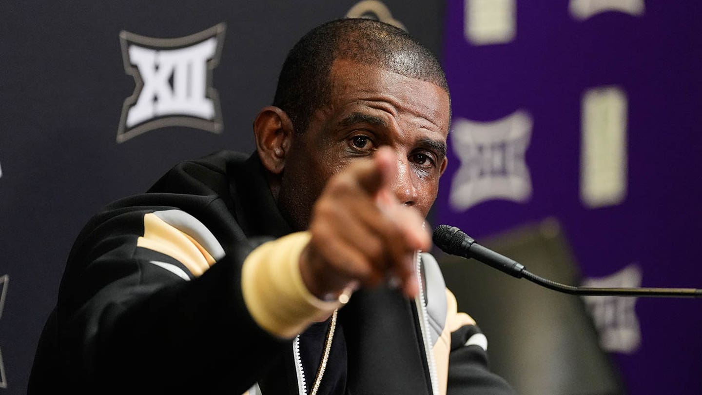 Colorado head coach Deion Sanders points as he answers a question during a news conference after the team’s NCAA College -Football match against TCU on Saturday, October 4, 2025 in Fort Worth, Texas. (AP Photo/Tony Gutierrez)