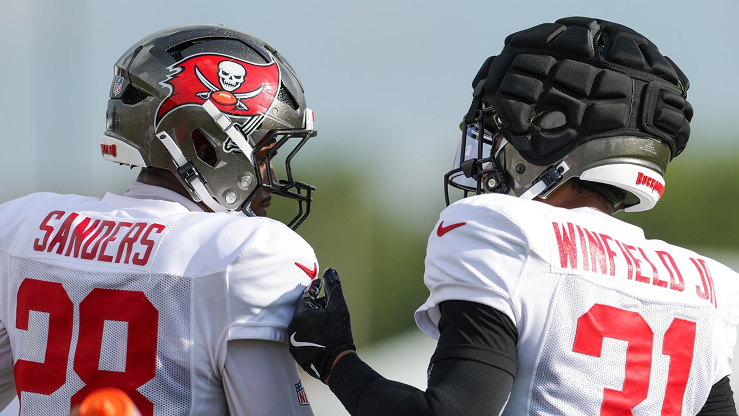 Tampa Bay Buccaneers Safety Shilo Sanders (28) talks with Safety Antoine Winfield Jr. (31) During training camp in Adventhealth Training Center. (Nathan Ray Seebeck/Imag- Pictures)