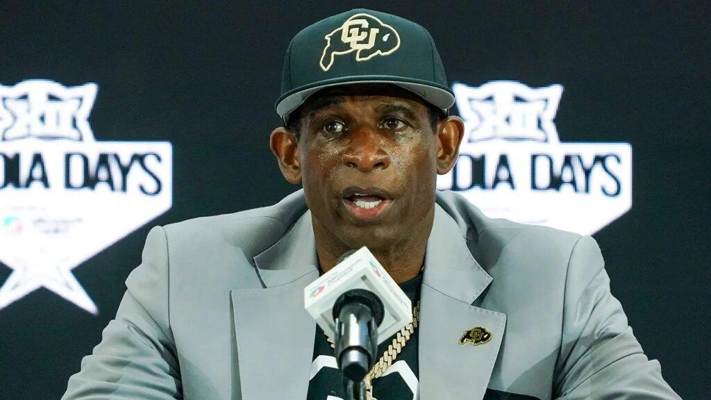 Colorado head coach Deion Sanders speaks under Big 12 NCAA College Football Media Day in Frisco, Texas, Wednesday, July 9, 2025. (AP Photo/LM OTERO)