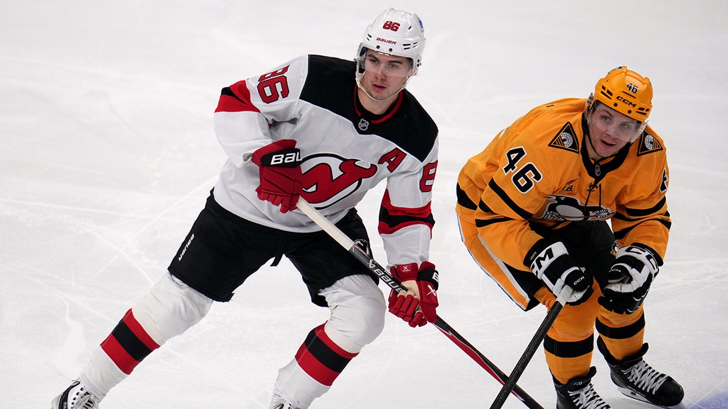 New Jersey Devils’ Jack Hughes (86) is defended by Pittsburgh Penguins’ Blake Lizotte (46) during the first period of an NHL hockey game in Pittsburgh, Pennsylvania. 26 February 2026. (Gene J. Puskar/AP Photo)