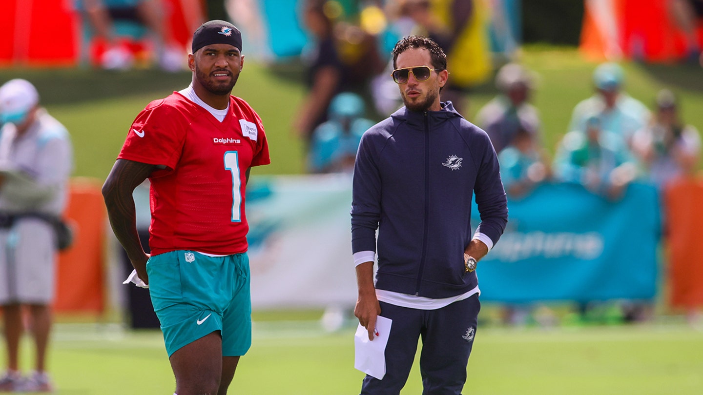 Miami Dolphins quarterback Tua Tagovailoa (1) talks with head coach Mike McDaniel during training camp at Baptist Health Training Complex on July 28, 2024 in Miami Gardens, Fla. (Sam Navarro/USA Today Sports)