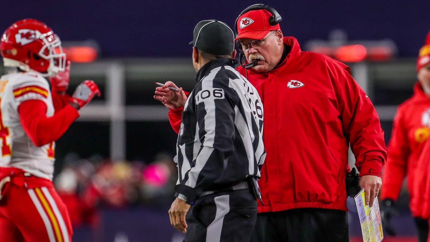 Kansas City Chief’s main coach Andy Reid talks to a judge during the first half against New England Patriots at Gillette Stadium in Foxborough, Mass., December 8, 2019. (Paul Rutherford/USA Today Sports)