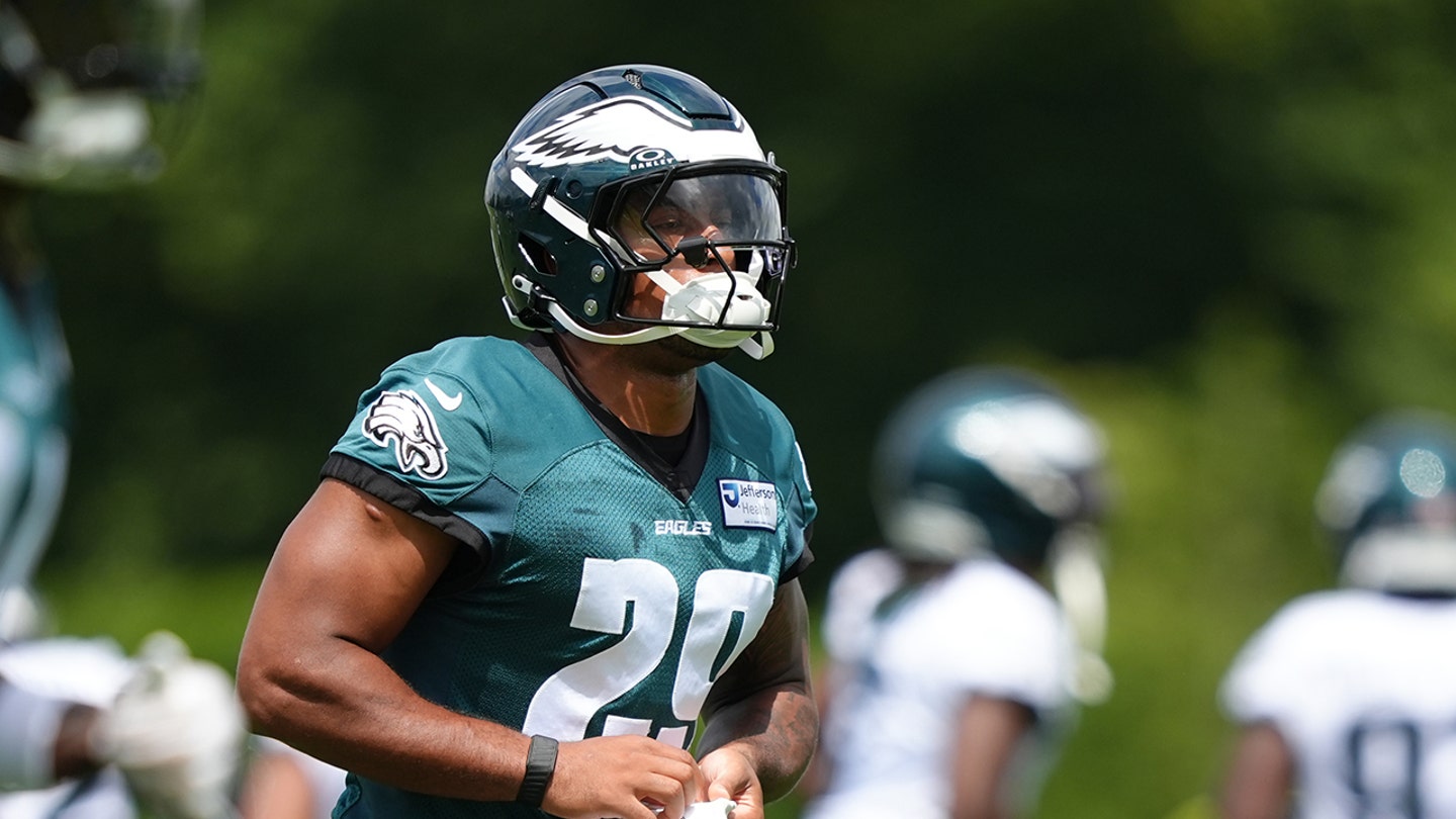 Philadelphia Eagles, which runs back AJ Dillon, #29, runs an exercise under the Philadelphia Eagles OTA’s on June 3, 2025 at the Novacare complex in Philadelphia. (Terence Lewis/Icon Sportswire via Getty Images)