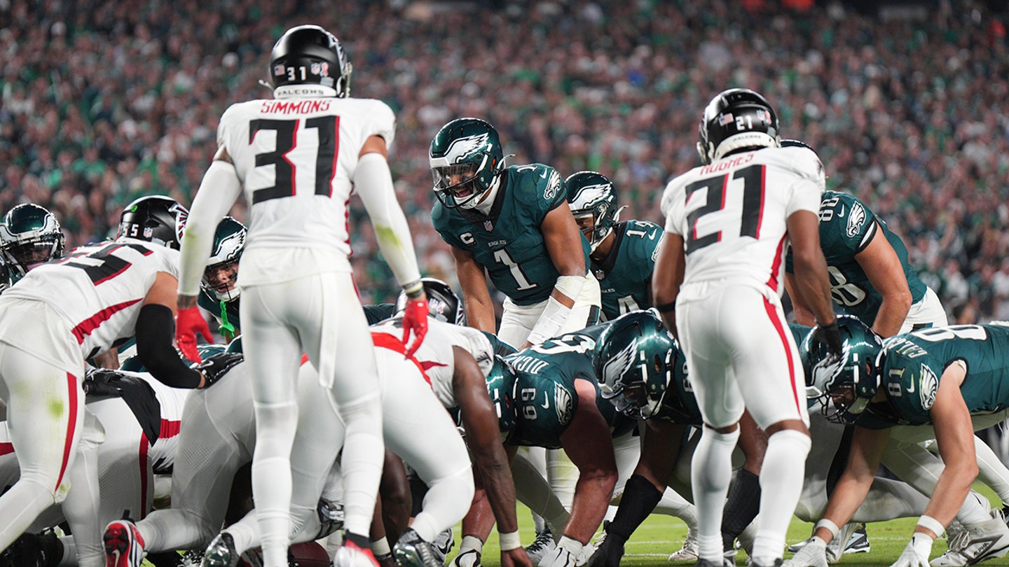 Philadelphia Eagles Quarterback Jalen Hurts (1) Prepares tush -push during the game between Philadelphia Eagles and Atlanta Falcons on September 15, 2024 at Lincoln Financial Field in Philadelphia, Pennsylvania. (Andy Lewis/Icon Sportswire via Getty Images)