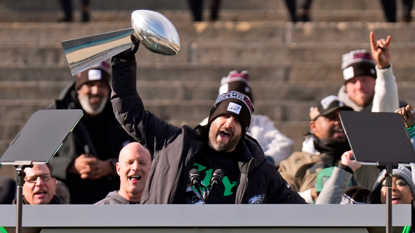 Philadelphia Eagles coach Nick Sirianni holds up Lombardi Trophy while talking under the team’s NFL Football Super Bowl 59 Parade and Celebration, Friday, February 14, 2025, in Philadelphia. (AP Photo/Chris Szagola)