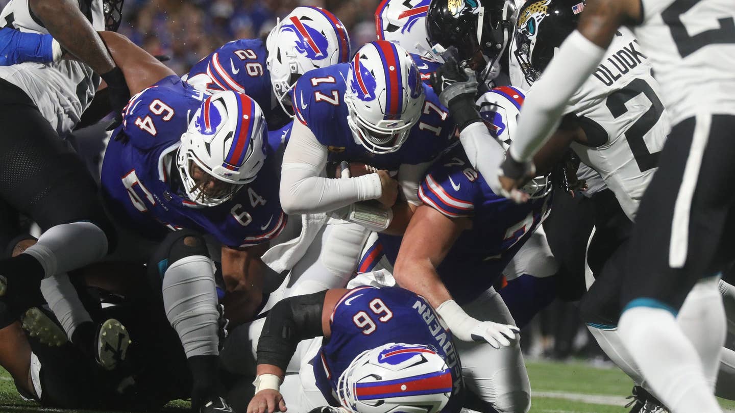 Bills quarterback Josh Allen gets 1-yard for a first down on the tush push play during first half action at Highmark Stadium in Orchard Park on Sept. 23, 2024.