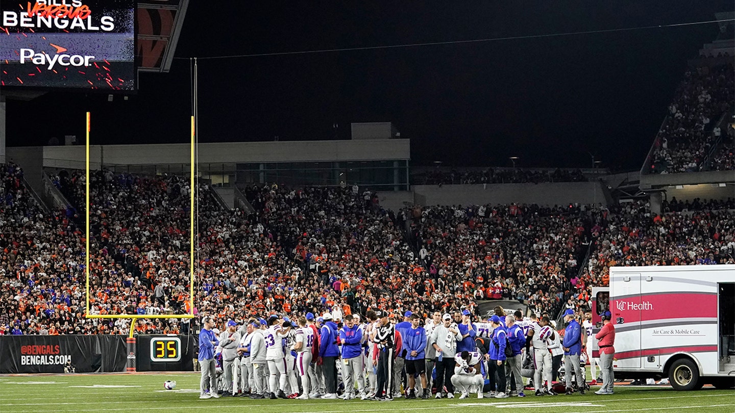 Buffalo Bills players pray for teammate Damar Hamlin during the first half of a game against Cincinnati Bengals 2 January 2023 in Cincinnati. (AP Photo/Joshua A. Bickel)