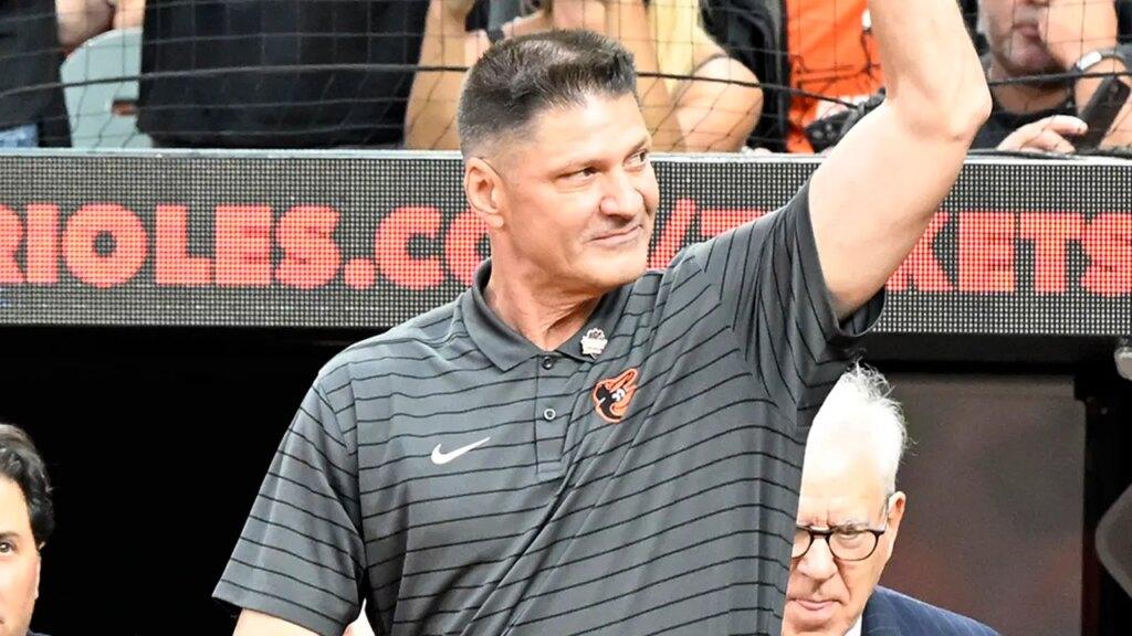 Ben McDonald is introduced to the crowd under Cal Ripken Jr. 2131 30 -Year anniversary ceremony before an Interleague game between Los Angeles Dodgers and Baltimore Orioles at Oriole Park on September 5, 2025 in Baltimore, Maryland. (Diamond images via Getty Images)