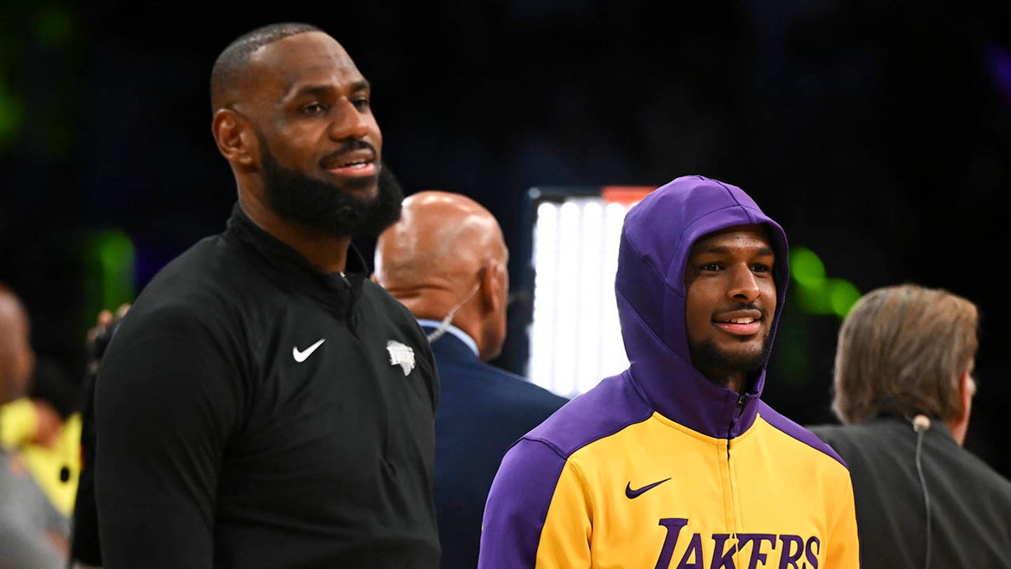 Los Angeles Lakers Guard Bronny James (9) and Frem LeBron James (23), warming up before the game against Phoenix Suns at Crypto.com Arena. (Jonathan Hui-Preferred Pictures)