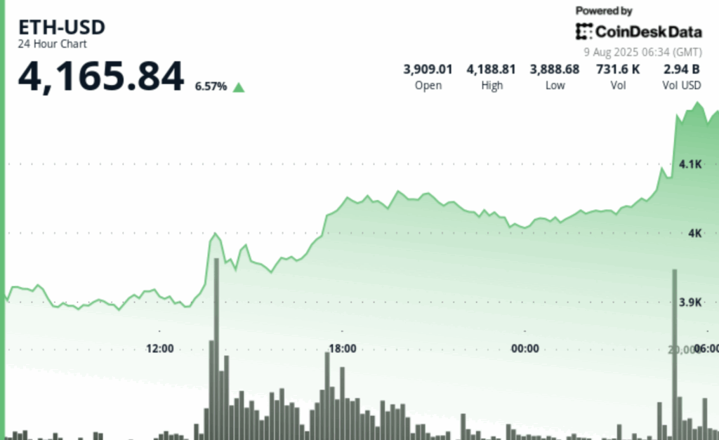 - In the last hour (9 August, 05: 19–06: 18 UTC)ETH moved from $ 4,157.33 to $ 4,194.53 before retiring to $ 4,158.50, with $ 42.52 in intraday swings.