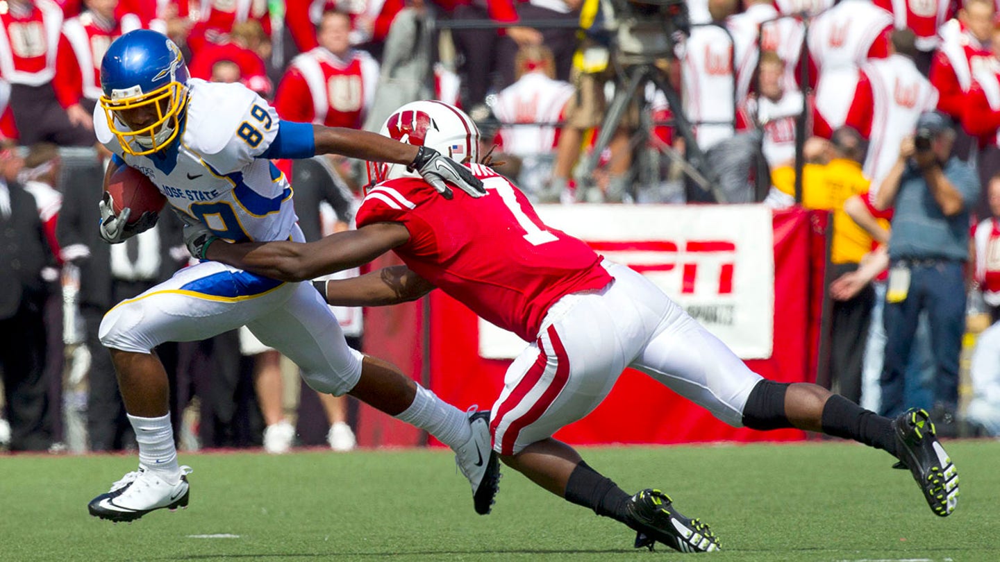 San Jose State Spartan’s wide receiver Chandler Jones, #89, rushes as Wisconsin Badgers Cornerback Aaron Henry, #7, makes a Takckle in the fourth quarter at Camp Randall Stadium in Madison, Wisconsin, September 11, 2010. (Jeff Hanisch -usa Today Sports)