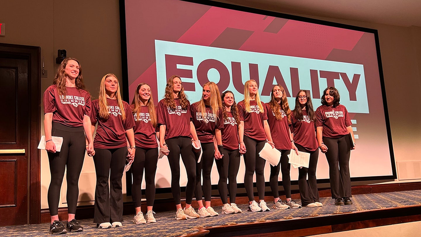 Members of Roanoke College Women’s Swim Team participate in a press conference. (Outkick)