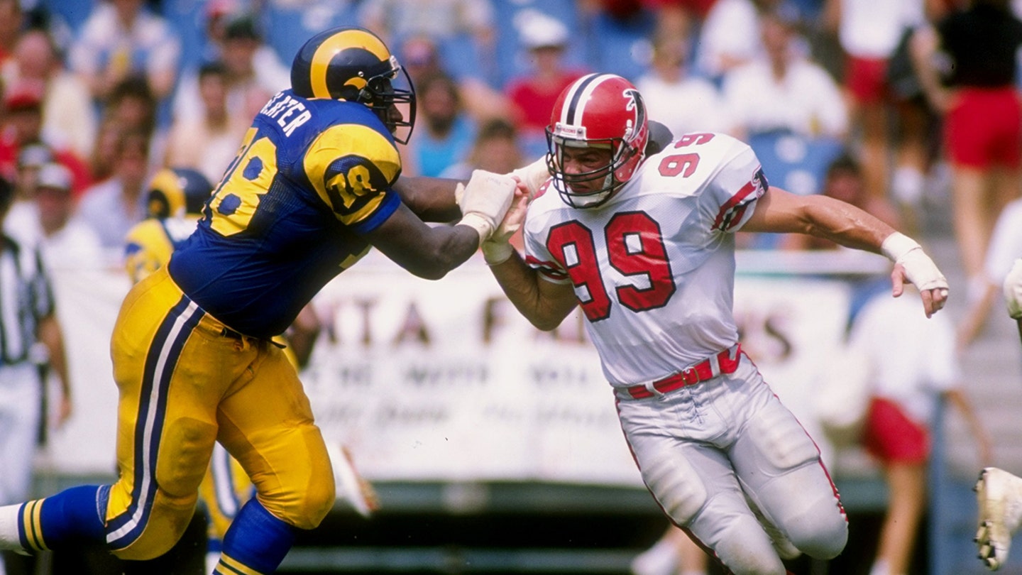 Defensive back Tim Green from Atlanta Falcons, #99, goes against the offensive tackle jackie slater from Los Angeles Rams, #78, during a game at Fulton County Stadium in Atlanta on September 10, 1989. (Getty Images)