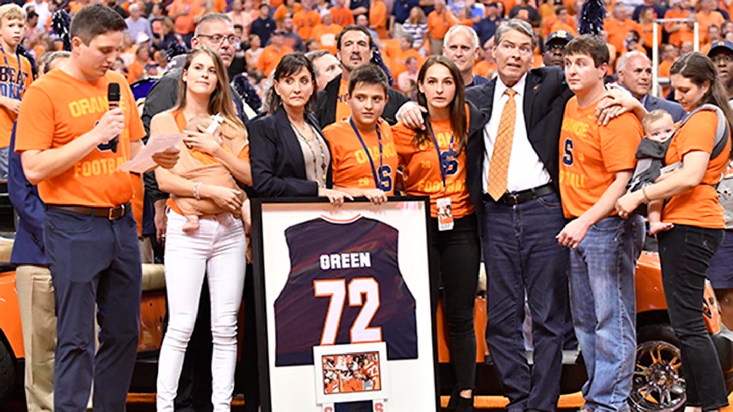 Former Syracuse Orange player Tim Green, surrounded by his family, looks at, while his son delivers a message during a break of ceremony to pull his number 72 jersey at the Carrier Dome on September 14, 2019 in Syracuse, New York. (Mark Kindenzny-usa Today Sports)