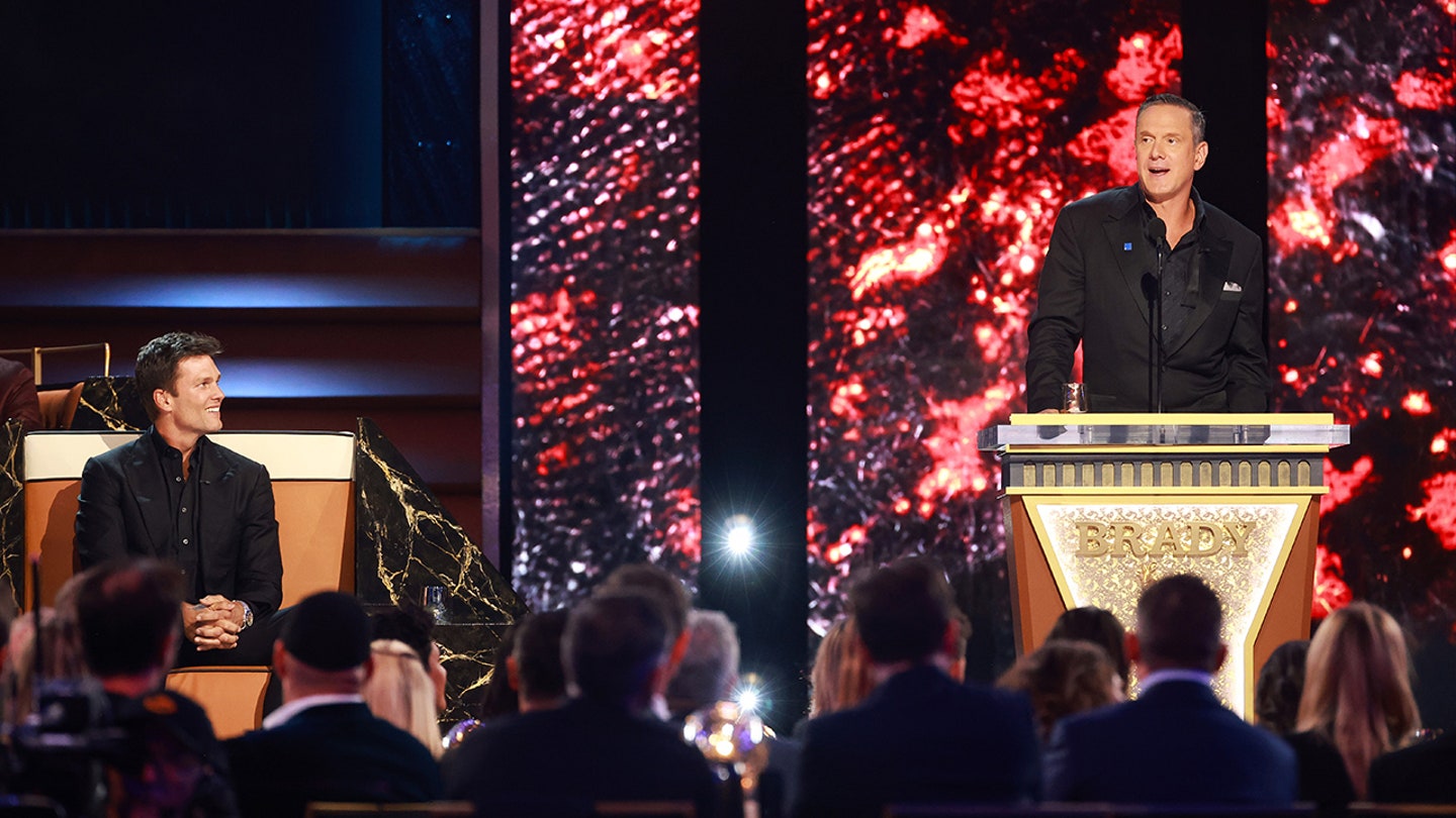 Tom Brady, Left, and Drew Bledsoe are talking on stage during “The Greatest Roast throughout the years: Tom Brady” for Netflix is a joke festival at Kia Forum 5 May 2024 in Inglewood, Calif. (Matt Winkelmeyer/Getty Images to Netflix)