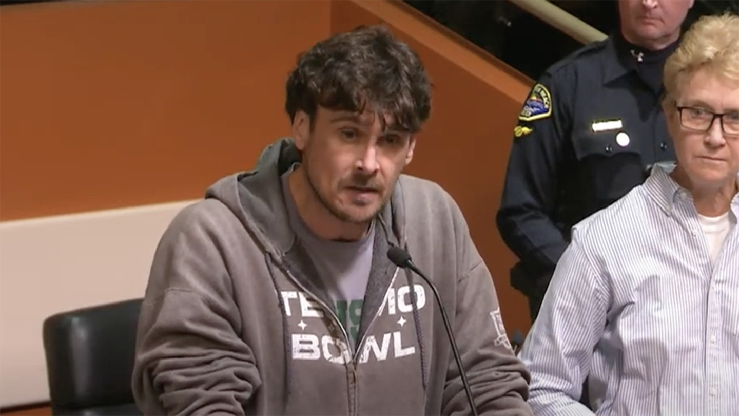 Former NFL player Chris Kluwe protests during the City Council meeting in Huntington Beach, California. (City of Huntington Beach)