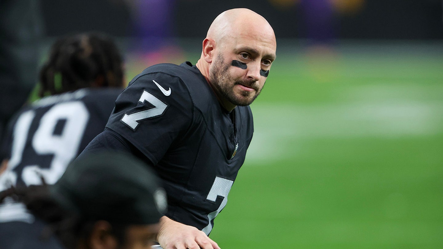 Brian Hoyer of the Las Vegas Raiders reacts before a game against the Minnesota Vikings at Allegiant Stadium in Las Vegas, Nev., on Dec. 10, 2023. (Steve Marcus/Getty Images)