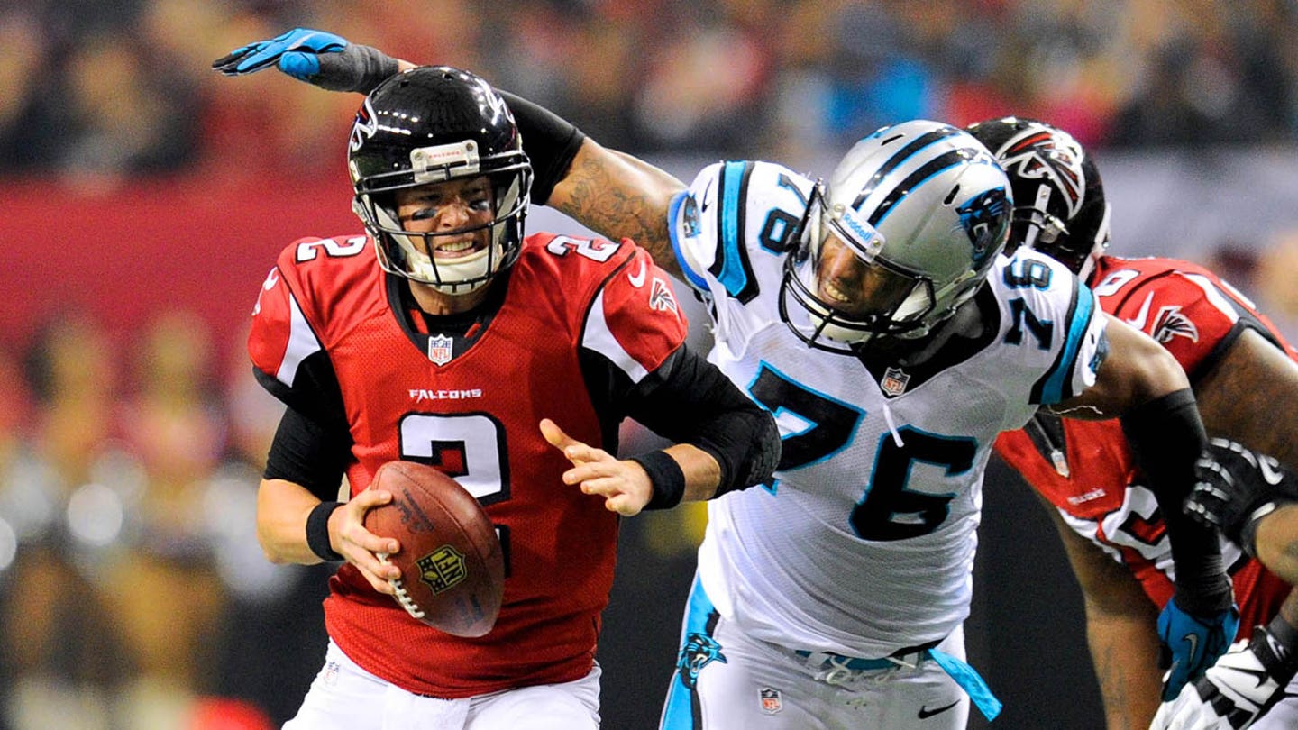 File – Carolina Panthers Defensive End Greg Hardy (76) Sack of Atlanta Falcons Quarterback Matt Ryan (2) over the second quarter of Georgia Dome on December 29, 2013. (Dale Zanine-usa Today Sports)